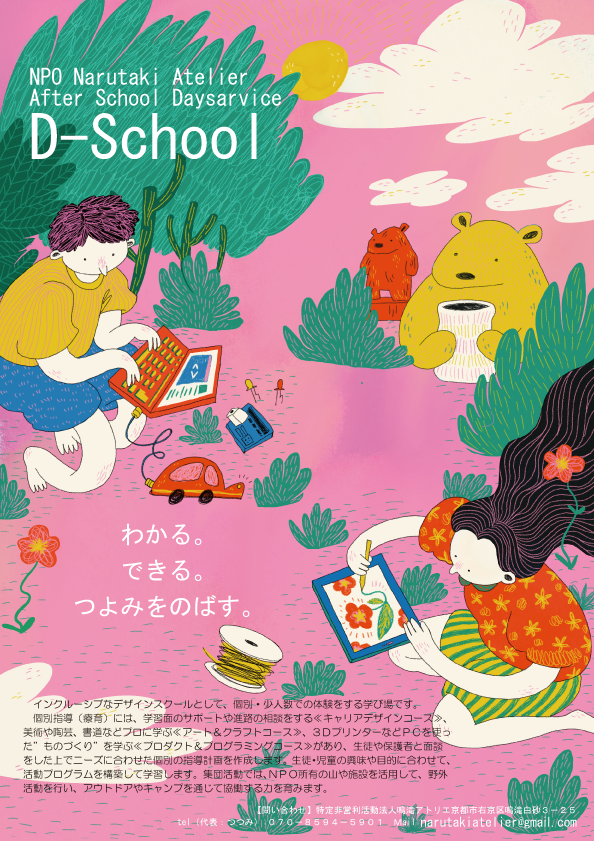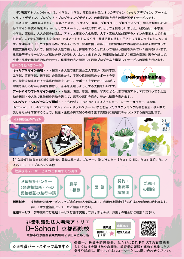 ・鳴滝Atelier…絵画、陶芸、彫刻、写真などのシェアアトリエ、文化教室、ものづくりFablabo(3Dプリンター、3DCAD、Photoshop,Illustrator,),大学受験対策指導(デッサン、AO対策,他)、プログラミング指導